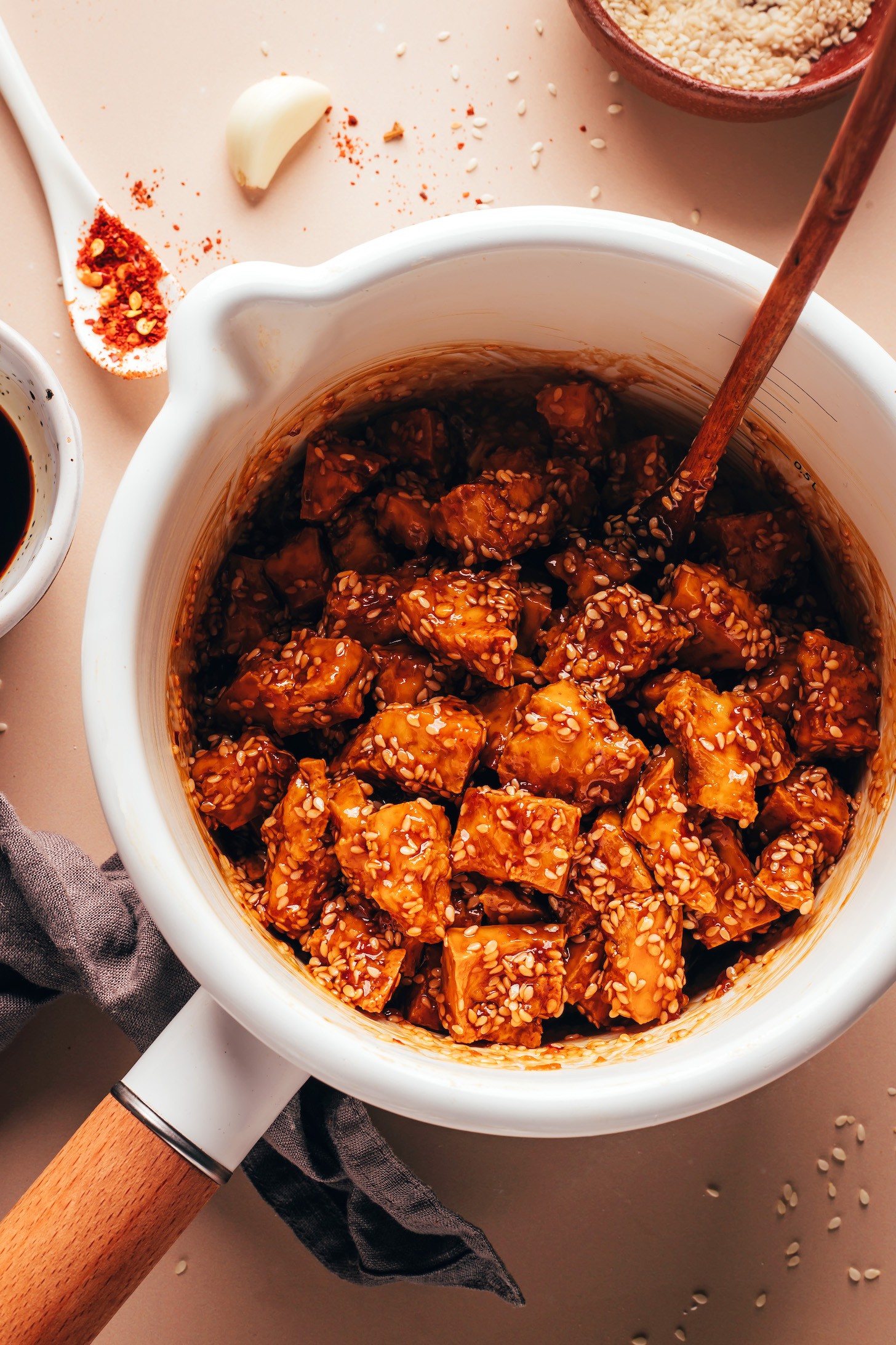Remove the tofu from the oven and transfer it to a bowl. Pour the warm sauce over the tofu and toss to coat evenly.