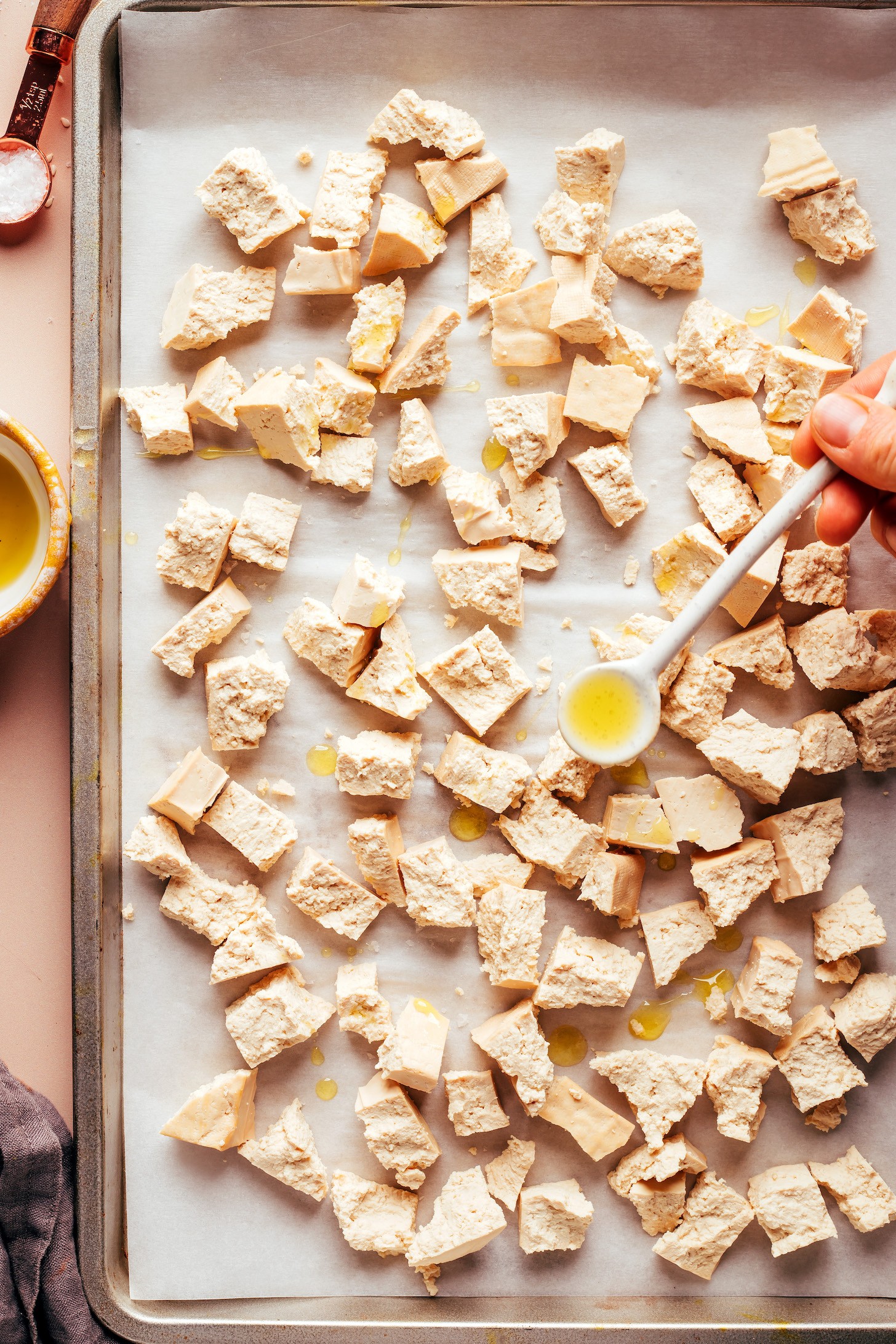 Spread the tofu on the baking sheet in a single layer. Bake for 25–30 minutes, flipping halfway, until golden and crisp.