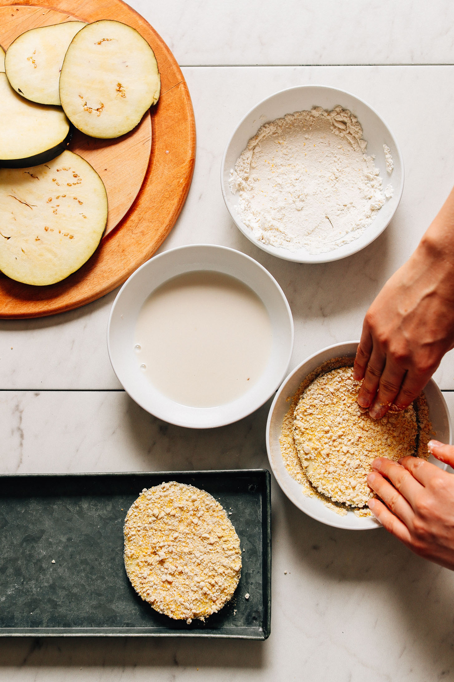 Dip each eggplant slice into the egg mixture, then coat evenly in the breadcrumb mixture.